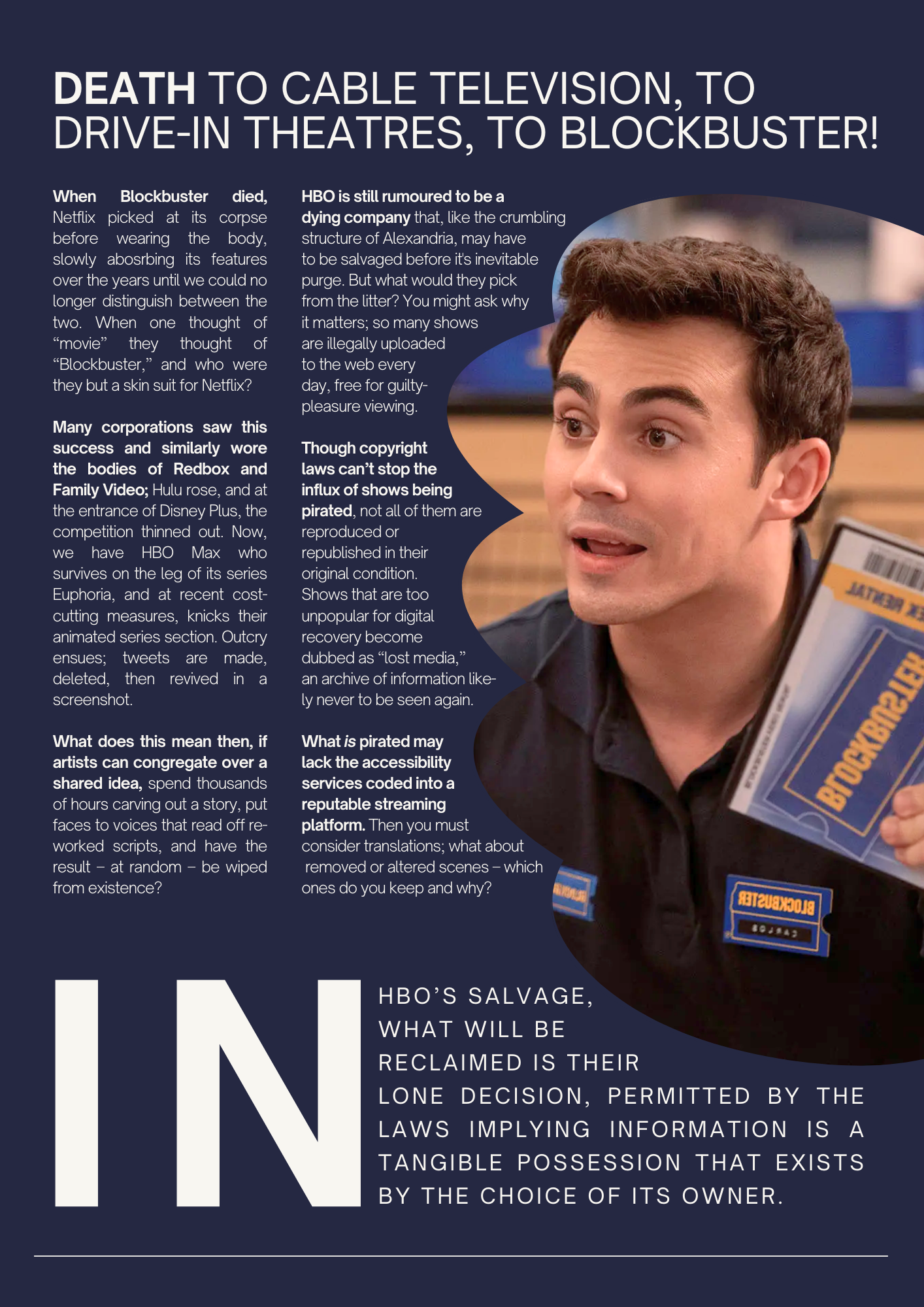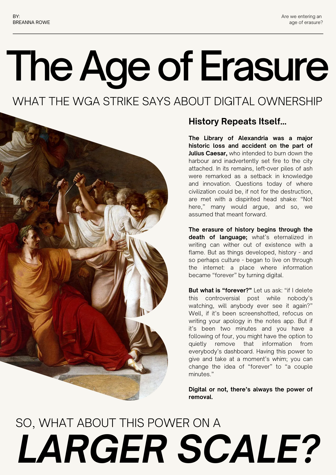 "The Age of Erasure" is a short essay I wrote inspired by the 2023 SAG-AFTRA strike. I spoke on the decreasing numbers of digital ownership in the streaming era and the increasing monopoly on labour.