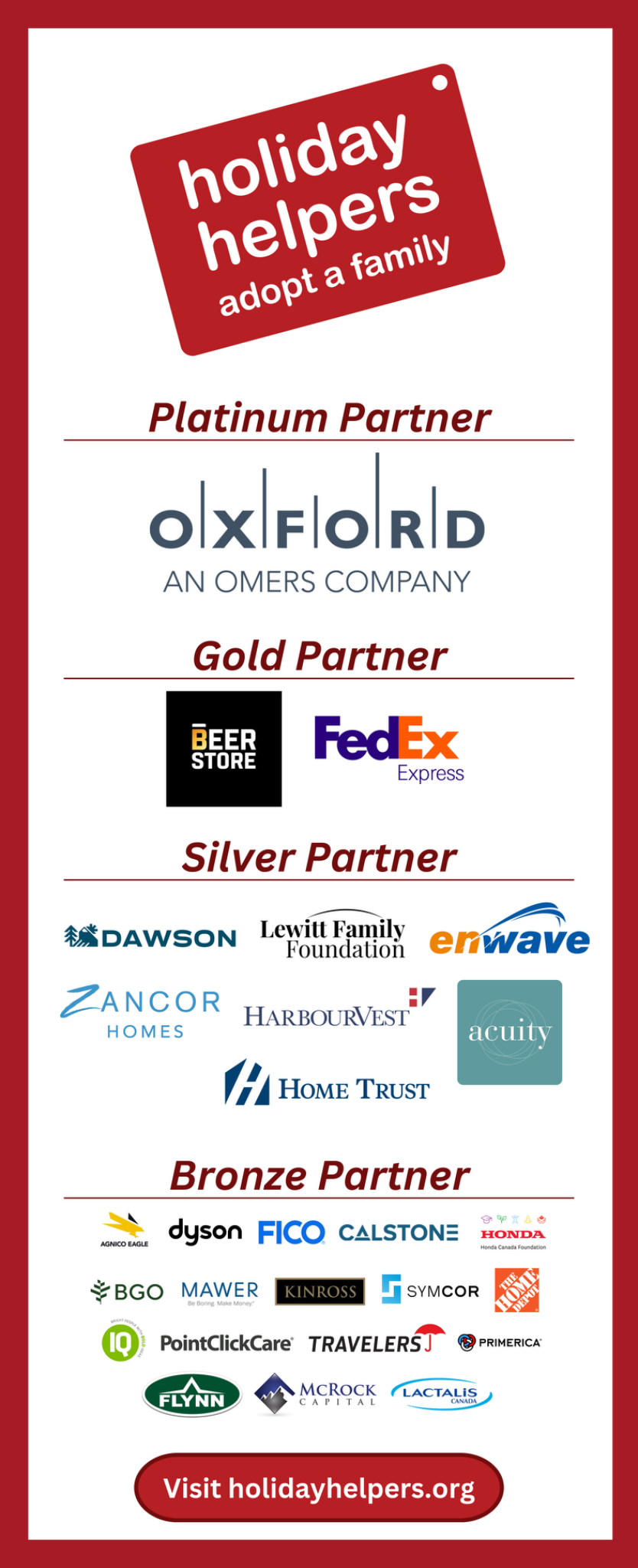 Holiday Helpers is a charity organization who focuses on supplying low-income families with food, clothes, and toys every Christmas across the GTA, Durham, and Hamilton regions.