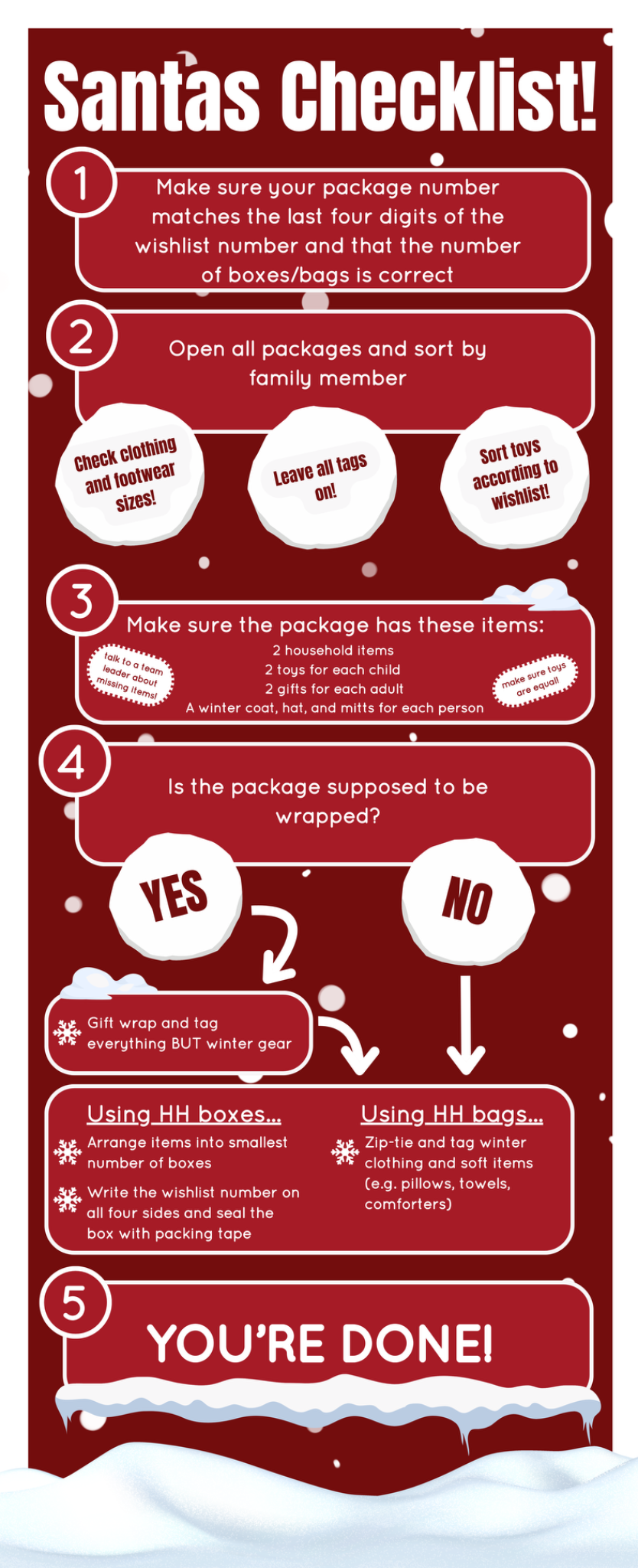 "Santa's Checklist" gift wrapping instructions placed in the warehouse as a guide for volunteers.